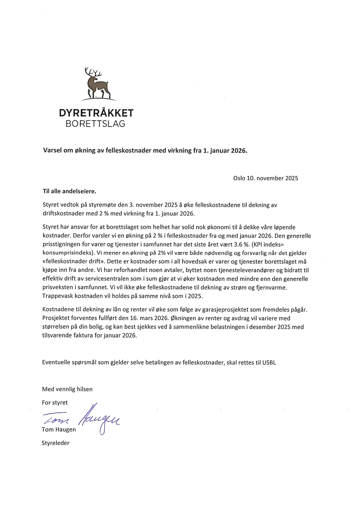 Styret vedtok på styremøte den 3. november 2025 å øke felleskostnadene til dekning av driftskostnader med 2 % med virkning fra 1. januar 2026.